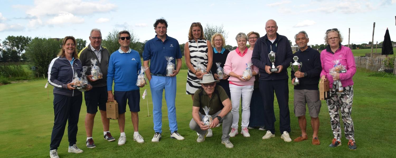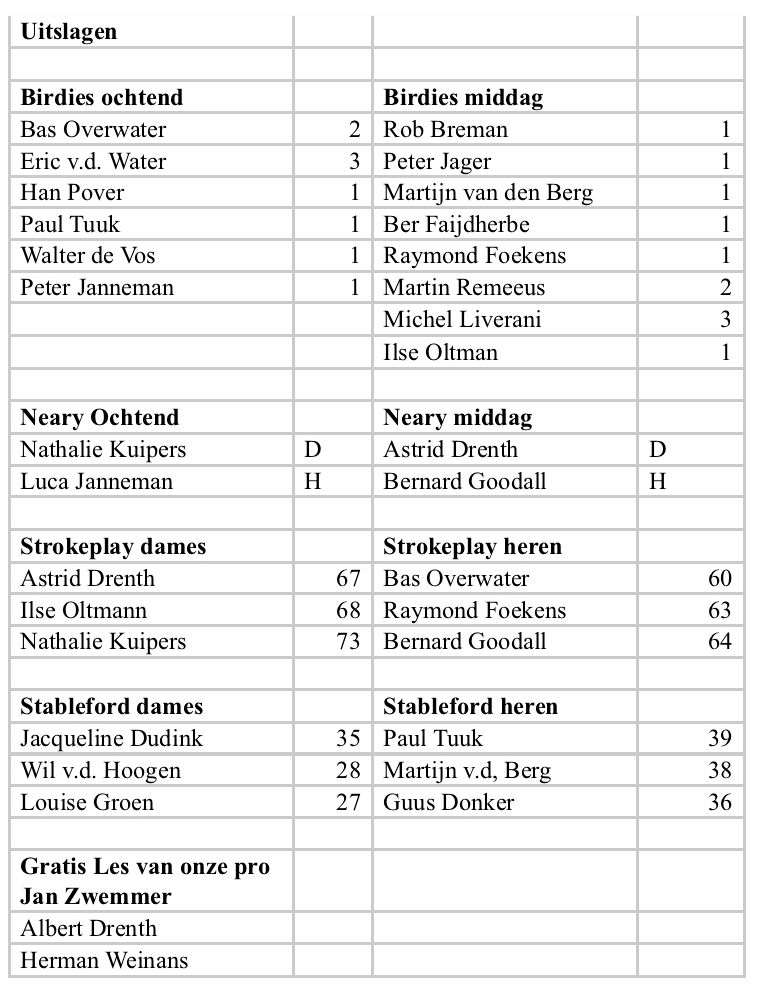 In de tussentijd had Henk ook de ochtenddeelnemers hun scores medegedeeld en werden de ochtendbirdies en de neary uitgereikt. Aan de top drie spelers werd gevraagd om 'stand by' te blijven omdat de officiële prijsuitreiking pas na de middageditie bekend zou worden. Heerlijk dat ook bij terugkomst van de deelnemers om ongeveer vijf uur ook weer alles gesmeerd liep, drankje sateetje en lekker op het terras napraten.